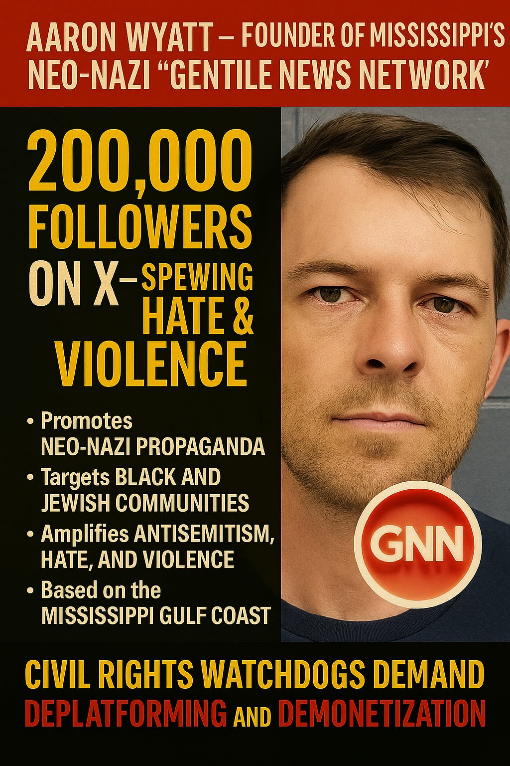 On the Mississippi Gulf Coast, a man named Aaron Wyatt has turned a homegrown “news” page into a bullhorn for white supremacist propaganda. He calls it the Gentile News Network (GNN). To his 200,000-plus followers on X, it’s a daily diet of racist, antisemitic, and anti-LGBTQ incitement. To Black Mississippians and the state’s Jewish community, it reads like a warning shot.