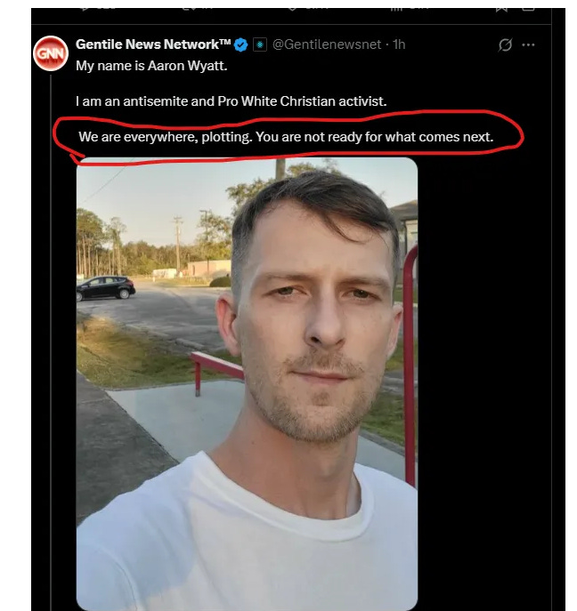 “My name is Aaron Wyatt. I am an antisemite and Pro White Christian activist. We are everywhere, PLOTTING. You are not ready for what comes next.”